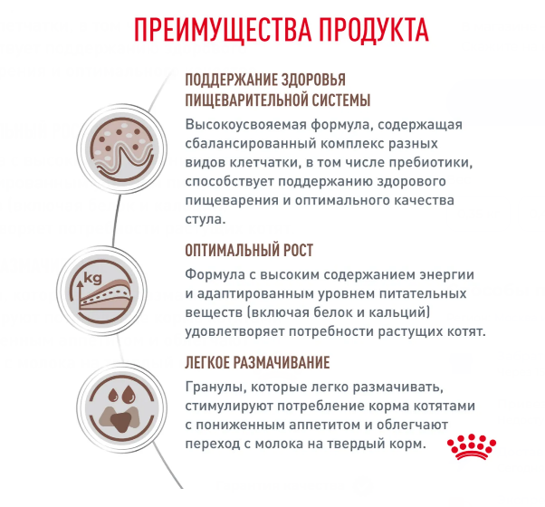 крокеты, которые легко размачивать, стимулируют потребление корма котятами с пониженным аппетитом и облегчают переход с молока на твердый корм. РЕКОМЕНДАЦИЯ: решение о продолжительности курса диетотерапии или смене диеты можно принимать только по рекомендации ветеринарного врача.