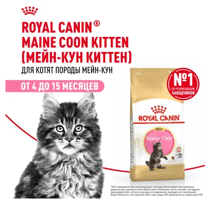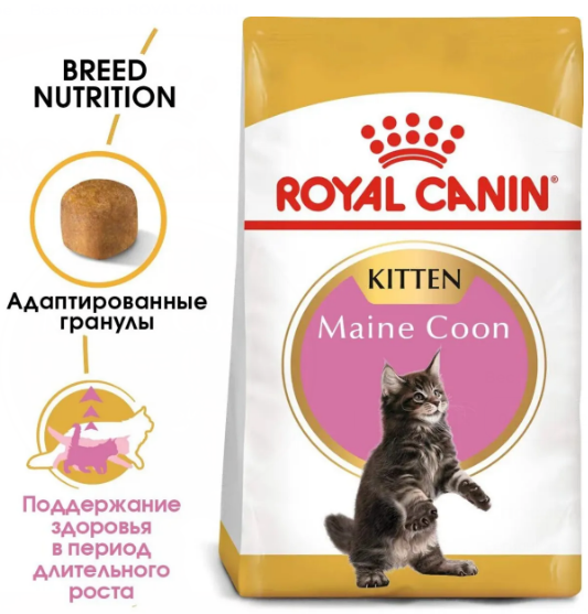 Корм сухой полнорационный сбалансированный для кошек - Специально для котят породы Мэйн Кун (в возрасте до 15 месяцев) MAINE COON KITTEN (МЕЙН КУН КИТТЕН) ROYAL CANIN, подходящий для котят породы мэйн кун в возрасте от 4 до 15 месяцев, специально разработан с учетом потребностей вашего котенка в питательных веществах в период роста.