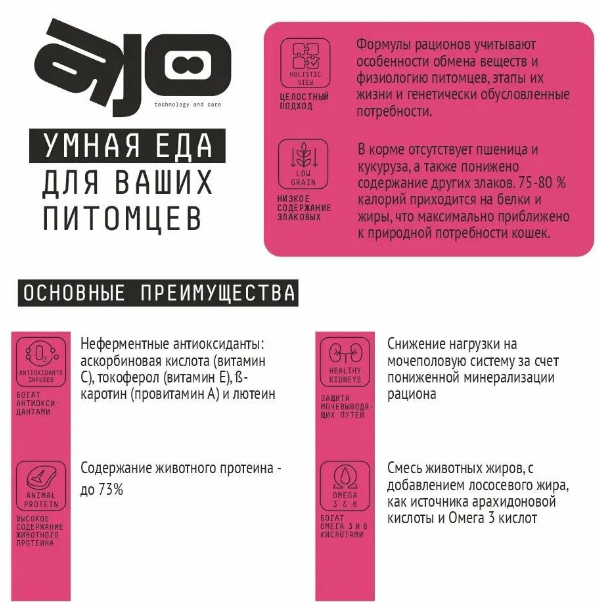 Выбирая сухой корм AJO для кошек, вы обеспечиваете своему питомцу сбалансированное питание и заботу о здоровье на каждом этапе жизни!