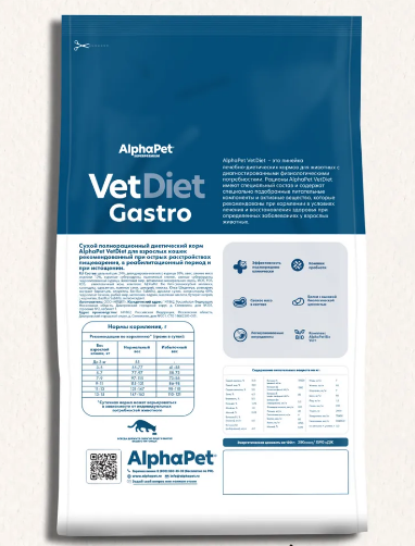 Корм ALPHAPET VET DIET GASTRO – это полнорационный диетический рацион для взрослых кошек, разработанный для животных с нарушениями работы пищеварительной системы, диареей, гастритом, а также для восстановления при истощении и после операций.