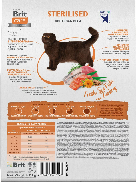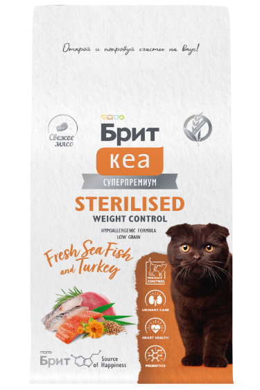 Полнорационный сухой корм суперпремиум класса с морской рыбой и индейкой для стерилизованных кошек. Контроль веса.