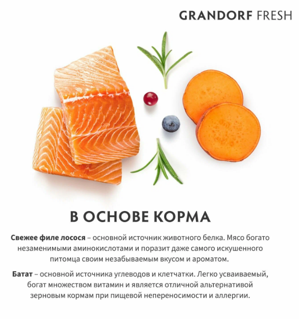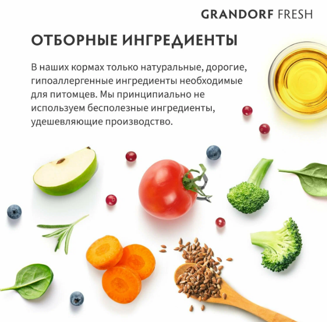 Каждый рацион Grandorf Fresh содержит один миллиард живых и полезных пробиотиков на один килограмм корма. Пробиотики поддерживают микрофлору кишечника, помогают усвоению питательных веществ и укрепляют иммунитет.