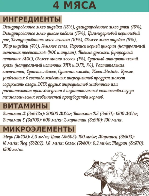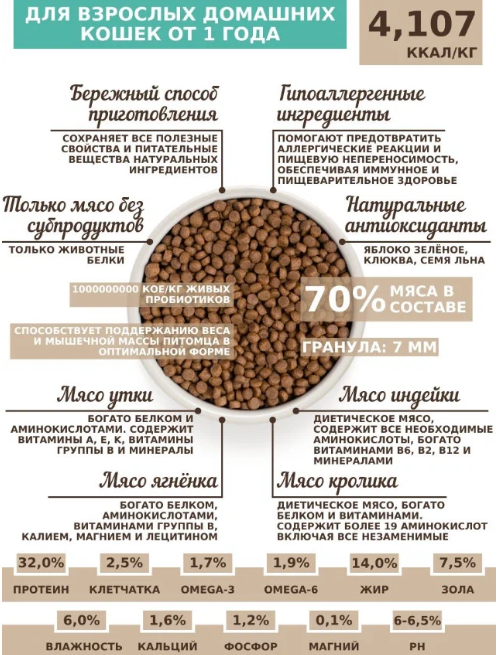 Для взрослых кошек от 1 года с нормальной активностью. Сухой низкозерновой корм класса холистик С живыми пробиотиками. Полезные свойства: поддержание сбалансированной микрофлоры, восстановление после лечения антибиотиками, противостояние болезнетворным бактериям, улучшение пищеварения, защита сердечно-сосудистой системы, укрепление суставов и развитие мышц, поддержка и укрепление зрения, профилактика мочевыводящих путей, улучшение состояния кожи и шерсти. Преимущества корма: 1,000,000,000,000 КОЕ/кг живых пробиотиков (Enterococcus faecium); гипоаллергенный состав ингредиентов класса HOLISTIC 70% высококачественного мяса в составе корма, более 10 полезных свойств для здоровья питомца, натуральный комплекс антиоксидантов, витаминов и минералов, оптимальный баланс жирных кислот Omega - 6 и Omega - 3, формула сохранена благодаря натуральным консервантам – витаминам C и E, особо бережная технология изготовления корма (до 80°С), низкая норма кормления и высокая усваиваемость. НЕ содержит: пшеницу, кукурузу, свеклу, субпродукты, яйца, курицу, куриный жир, соль, красители, искусственные ароматизаторы и наполнители, сою и ГМО. Инновации: Живые пробиотики (стабилизаторы кишечной флоры),