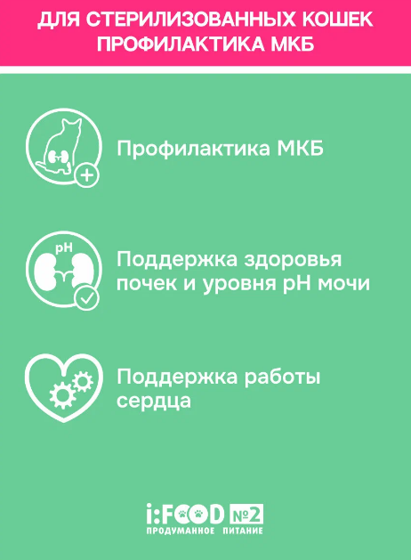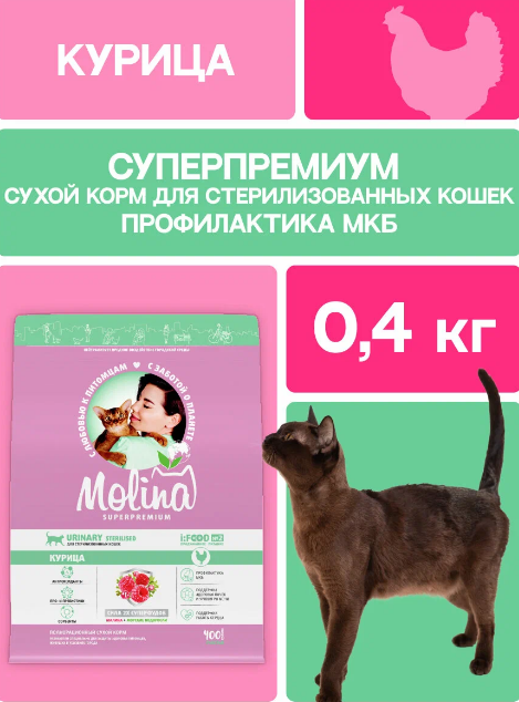 Molina Superpremium с курицей для взрослых стерилизованных кошек разработан с учетом поддержания здоровья мочевыделительной системы для профилактики мочекаменной болезни (МКБ), контроля веса. Оптимальный баланс белков и жиров способствует сохранению мышечной массы и активности питомца. Натуральные ингредиенты, Омега-3 и Омега-6 жирные кислоты, пробиотики и антиоксиданты поддерживают пищеварение, иммунитет и состояние шерсти.
