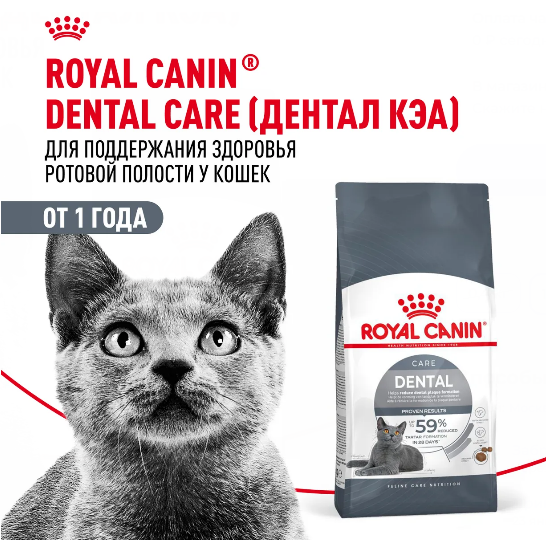Корм сухой полнорационный сбалансированный для взрослых кошек - Рекомендуется для профилактики образования зубного налета и формирования зубного камня DENTAL CARE (ДЕНТАЛ КЭА) ROYAL CANIN , подходящий для взрослых кошек в возрасте старше 1 года.