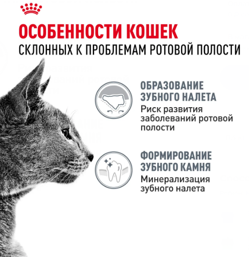 Формула сухого продукта ROYAL CANIN Dental Care (ДЕНТАЛ КЭА) обеспечивает гигиену ротовой полости вашей кошки и снижает образование зубного налета, а также способствует здоровью мочевыделительной системы кошки.
