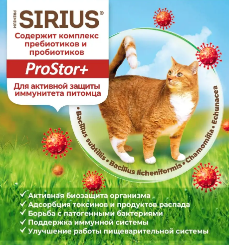 Сухой корм премиум класса SIRIUS (Сириус) для взрослых кошек, Лосось и рис — сухой корм премиум-класса для полноценного ежедневного рациона взрослых кошек. Высокое содержание мясных ингредиентов обеспечивает оптимальный уровень белка и укрепляет мышцы. Баланс витаминов и комплекса пробиотиков 4-го поколения PROSTOR+ нормализует пищеварение и укрепляет иммунитет. Омега 3 и Омега 6 способствуют поддержанию здоровья сердца, мозга, нервной системы, здоровья кожи и красоты шерсти.