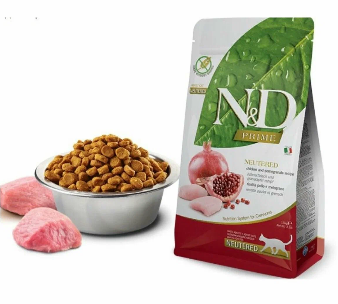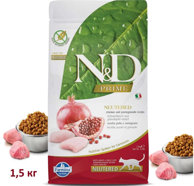 Корм для стерилизованных кошек Farmina из серии N&D Prime — это беззерновой продукт с курицей и гранатом. Этот корм весом 1500 г разработан специально для стерилизованных кошек, обеспечивая их необходимыми питательными веществами и витаминами. Корм не содержит ГМО (Генномодифицированных организмов).