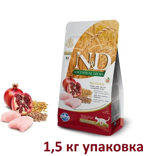 Полнорационный сухой корм Farmina N&D Low Grain Cat Chicken&Pomegranate Neutered разработан специально для стерилизованных кошек и кастрированных котов.