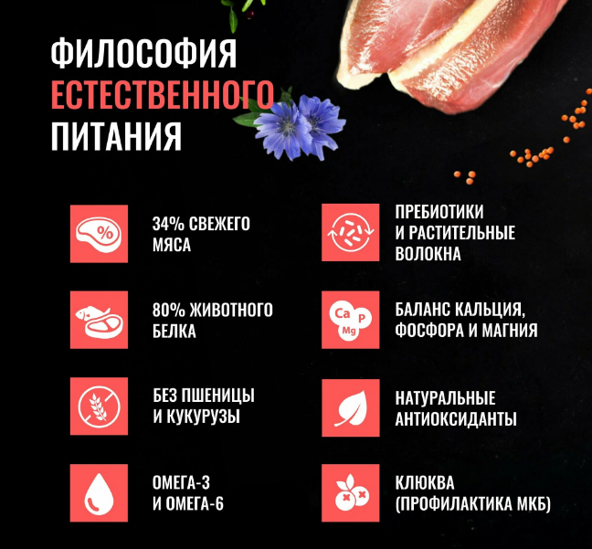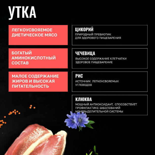 Основной ингредиент корма - свежее мясо утки, которое содержит все незаменимые аминокислоты, необходимые для здоровья питомца. Натуральные белки из свежего мяса легко усваиваются организмом животного, способствуя росту и поддержанию мышечной массы.