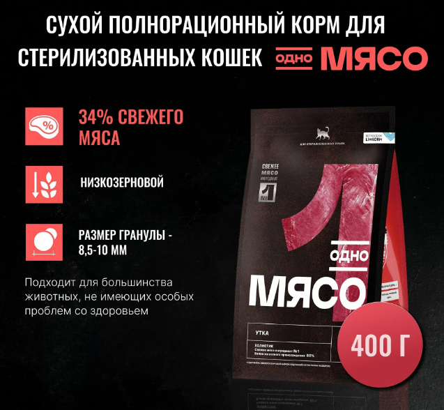 Одно мясо 400г полнорационный корм для стерилизованых кошек с мясом утки