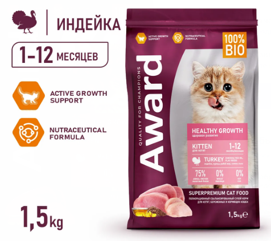 Сухой корм AWARD Healthy growth для котят от 1 месяца, беременных и кормящих кошек с индейкой и курицей с добавлением рыбьего жира и семян льна 1,5 кг.