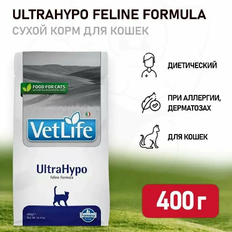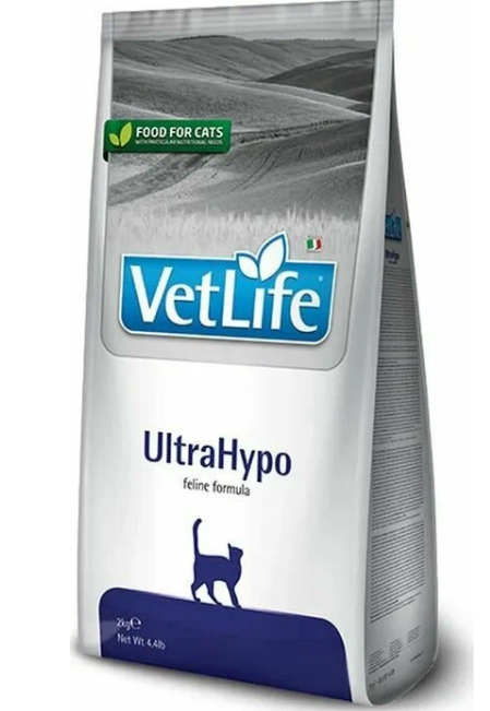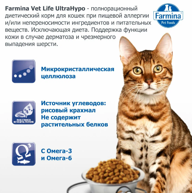 FarminaVetLifeUltraHypo - диетический сухой корм для кошек при неблагоприятной реакции на пищу (пищевая аллергия и/или пищевая непереносимость). Может быть использована в качестве диагностического теста (исключающая диета). Рекомендована в качестве диетотерапии при хронических воспалительных заболеваниях кишечника (IBD), рецидивирующей рвоте.