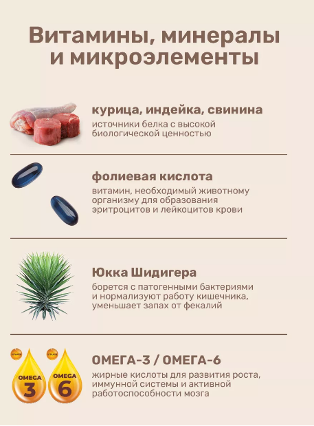 А для развития имунной системы, работоспособности мозга, здоровой кожи и красивой шерсти, мы добавили в сухой корм жирные кислоты Омега 3 и Омега 6.