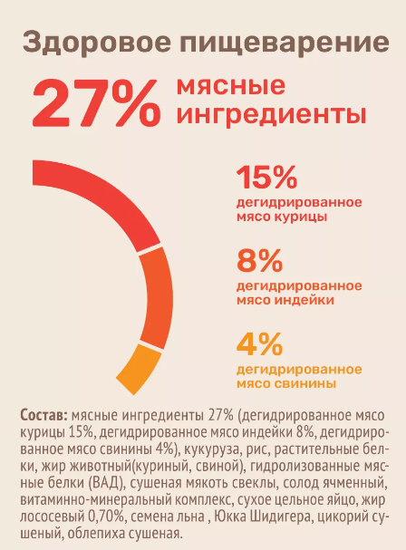 Благодаря высокому содержанию мясных ингредиентов и животных жиров, корм обладает превосходной вкусовой привлекательностью, ваши любимцы не останутся равнодушными.