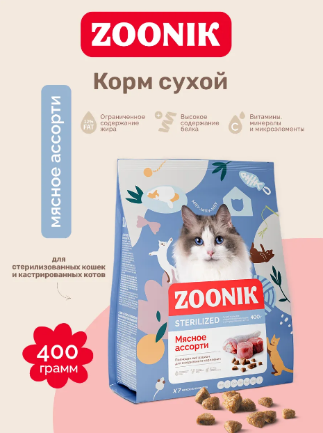 ZOONIK сухой корм для взрослых стерилизованных кошек, мясным ассорти 0,4 кг