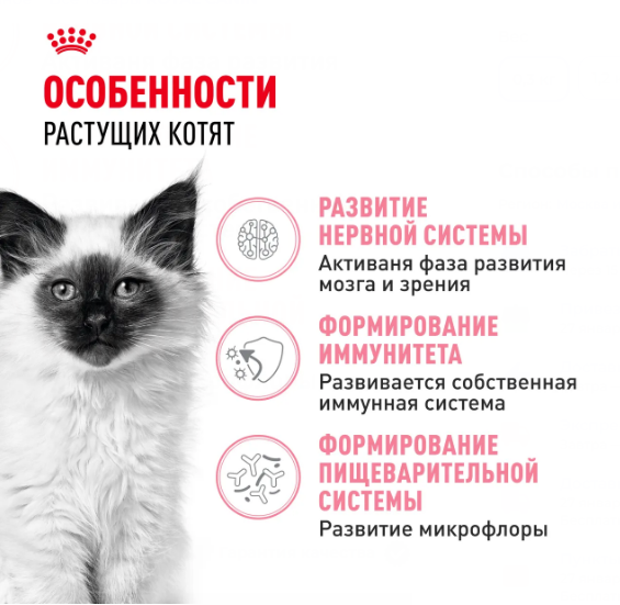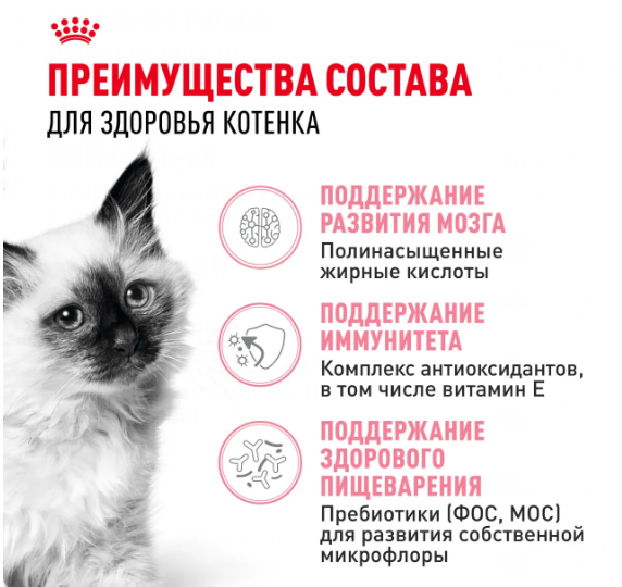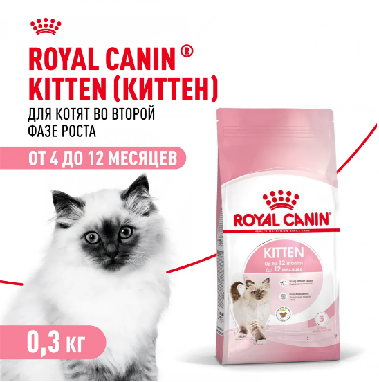 Продукт ROYAL CANIN Kitten разработан с учетом потребностей в питательных веществах котят во второй фазе роста. Рацион предназначен для котят в возрасте от 4 до 12 месяцев, вступающих в период значительных перемен физического состояния и поведения. Этот продукт также поддерживает формирование здоровой иммунной системы котенка за счет содержания питательных веществ с научно доказанной эффективностью, таких как витамины С и Е. Согласно исследованиям, эти пищевые антиоксиданты стимулируют более высокий и быстрый подъем уровня антител после вакцинации. ROYAL CANIN Kitten обогащен полиненасыщенной жирной кислотой Омега-3 (ДГК), которая поддерживает развитие мозга и зрения котенка. Благодаря сочетанию пребиотиков (МОС) и легкоусвояемых белков, формула ROYAL CANIN Kitten поддерживает баланс микрофлоры кишечника, способствуя здоровому пищеварению. Специально разработанные гранулы продукта ROYAL CANIN Kitten подходят для крошечных челюстей котят и облегчают процесс захватывания и разгрызания корма, а также поддерживают здоровье полости рта за счет эффекта механической очистки зубов во время их разгрызания.