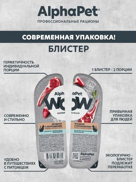 Здоровый и активный питомец – главная задача каждого хозяина. Команда AlphaPet® создает и производит полезные корма высшей категории качества Holistiс, давая возможность каждому владельцу быть уверенным в правильном выборе кормления для своего животного. AlphaPet® WOW - линейка качественного питания по доступной цене для животных, владельцы которых хотят быть уверены в выборе лучшего качества рациона по разумной цене. Максимально открытый и понятный состав кормов, приготовленных по инновационной технологии из свежего мяса и с содержанием более чем 90% мясного белка! Линейка влажных кормов AlphaPet так же содержит: Ингредиенты качества Human Graid Уникальный комплекс AlphaPetBio Рис - для чувствительного пищеварения *Не содержит ГМО искусственных красителей, ароматизаторов, консервантов, пшеницу, кукурузу и глютен.