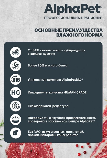 Основной ингредиент корма - птица, в том числе утка и курица, а также клюква и рис. Мясные кусочки в соусе содержат 90% свежего мяса и субпродуктов, витаминно-минеральную смесь и комплекс AlphaPetBio.