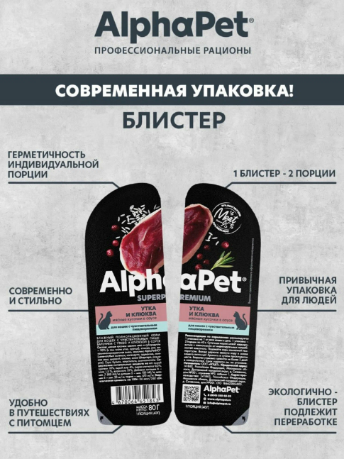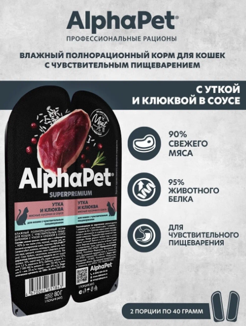 AlphaPet Superpremium влажный корм для кошек с чувствительным пищеварением, с уткой и клюквой, в ламистерах - 80 г.