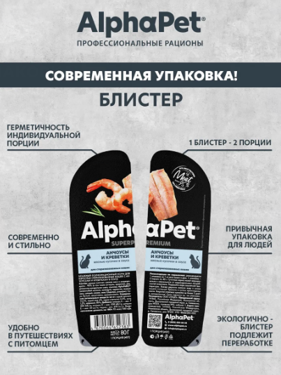 ALPHAPET SUPERPREMIUM 80 гр ламистер вл. корм для стер. кошек анчоусы и креветки