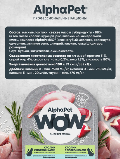 AlphaPet WOW - линейка качественного питания по доступной цене для животных, владельцы которых хотят быть уверены в выборе лучшего качества рациона по разумной цене. Максимально открытый и понятный состав кормов, приготовленных по инновационной технологии из свежего мяса и с содержанием более чем 90% мясного белка!