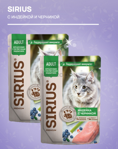 Sirius влажный корм для взрослых кошек с чувствительным пищеварением, с индейкой и черникой в соусе 85 гр.