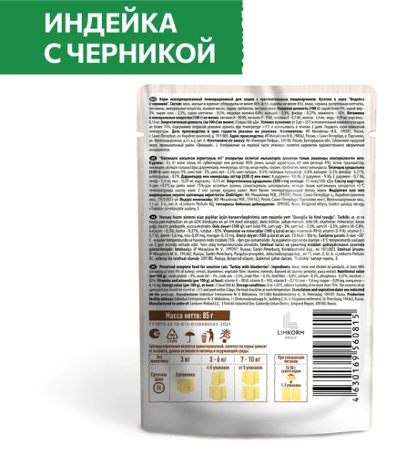 Консервированный полнорационный корм для кошек с чувствительным пищеварением с индейкой и черникой. Кусочки в соусе для полноценного ежедневного рациона взрослых кошек.