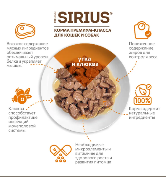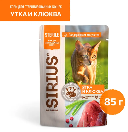 SIRIUS — влажный корм премиум-класса для полноценного ежедневного рациона стерилизованных кошек.