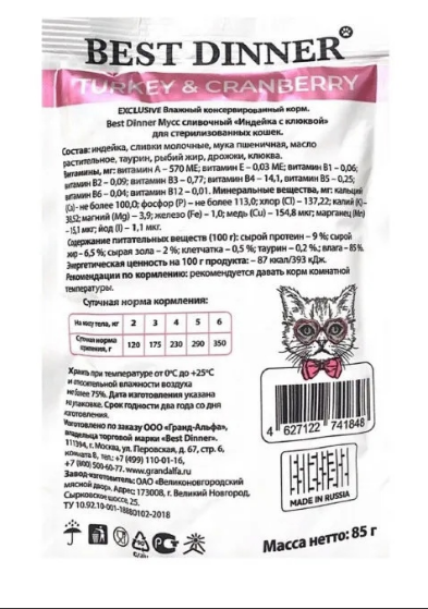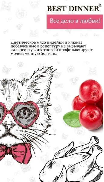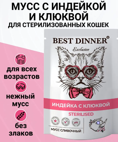 Best Dinner Exclusive Sterilised мусс сливочный индейка с клюквой паучи для стерилизованных кошек 100 гр.