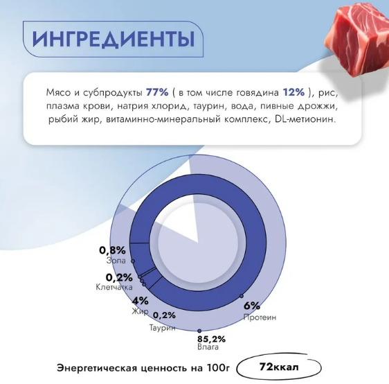 Влажный консервированный профилактический корм для кошек с заболеваниями почек содержит умеренное количество легкоусваиваемого животного белка из натурального мяса говядины.