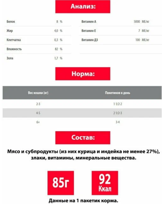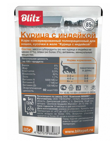 Полнорационный влажный корм Blitz для кошек «Курица с индейкой» обогащён всеми необходимыми витаминами и микроэлементами, поэтому ваш питомец сможет наслаждаться его потрясающим вкусом каждый день, радуя вас красотой своей шерсти, хорошим самочувствием и прекрасным настроением. А ещё этот рацион гарантирует вашей кошке отличный аппетит, поэтому соблюдайте нормы кормления, указанные на упаковке.