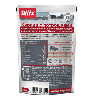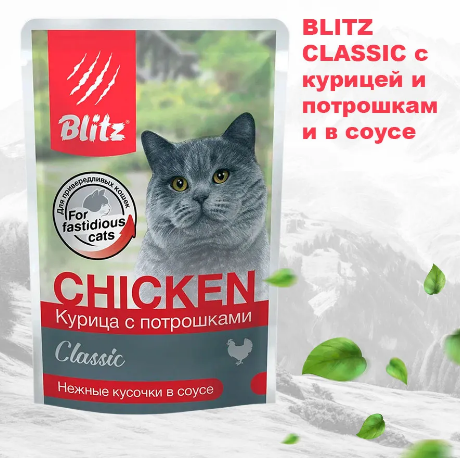 Для полноценного питания кошке нужно не только мясо как высококачественный источник животного белка, но и субпродукты, которые содержат множество витаминов, в особенности A и D, микроэлементов, например, фосфора, йода, железа, калия и магния, а также Омега-3 жирных кислот, необходимых для здоровья кожи и шерсти. Именно по этому принципу создан корм Blitz «Курица с потрошками», который полезен и нравится даже самым требовательным питомцам, привлекая их своим ароматом.