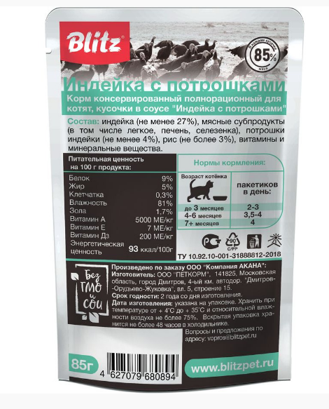Нежные мясные кусочки в ароматном соусе — то, что нужно для растущего организма и чувствительного пищеварения котят. Они на 85% состоят из индейки и полезных субпродуктов — лёгкого, печени и селезёнки, не содержат консервантов, красящих добавок, ароматизаторов, подсластителей, грубых волокон и крахмала — всё это противопоказано для малышей.