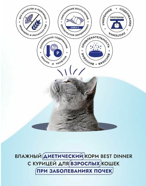 Влажный корм для кошек Best Dinner Exclusive Vet Profi Renal Курица в соусе (кусочки) 85 г - это высококачественный супер-премиум корм, разработанный специально для взрослых кошек с проблемами почек. Этот корм содержит умеренное количество легкоусваиваемого животного белка из натурального мяса курицы, что способствует поддержанию здоровья почек.