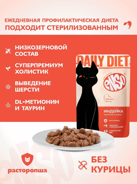 ENSO DAILY DIET корм для кошек для поддер здор печени, кусочки в соусе с индейкой 85 гр