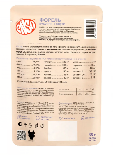 ENSO DAILY DIET корм для взрослых кошек для кожи и шерсти, кусочки в соусе форель 85 гр