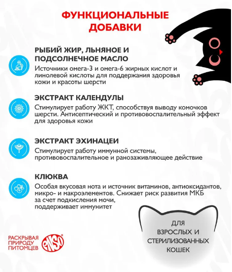 Низкозерновая рецептура без глютена с тщательно подобранными витаминами и минералами, отсутствие ГМО и идеальное сочетание вкуса позволят взрослым и стерилизованным кошкам всегда оставаться активными и здоровыми, проявлять и сохранять свою настоящую сущность.