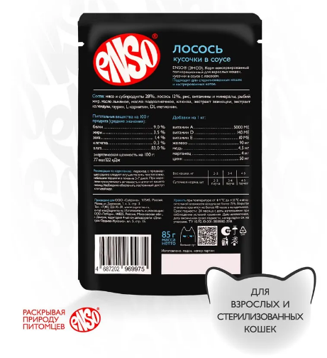 По своей природе кошки достаточно избирательны в еде, это практически запрограммировано в их ДНК. Благодаря сбалансированному составу и натуральным ингредиентам, нежные мясные кусочки ENSO® в аппетитном соусе очаруют кошек уже при первом знакомстве с кормом.