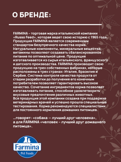 Предки кошек – хищники, и для того, чтобы обеспечить Вашего питомца биологически соответствующим кормом, включающим в себя все ингредиенты природного рациона плотоядных, компания FARMINA разработала уникальную рецептуру, которая подходит даже для самых привередливых четвероногих гурманов.
