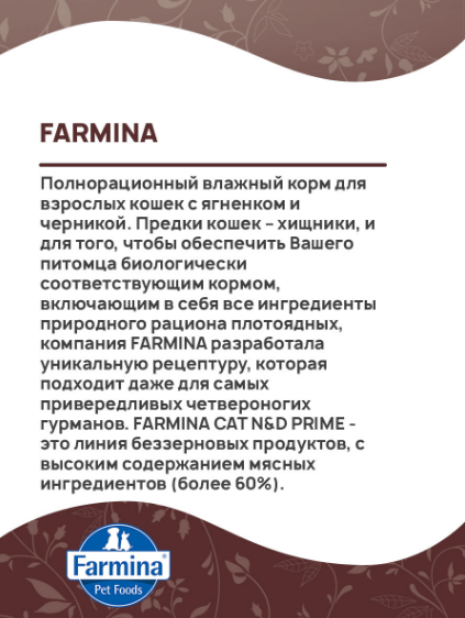 FARMINA CAT N&D PRIME - это линия беззерновых продуктов, с высоким содержанием мясных ингредиентов (более 60%).
