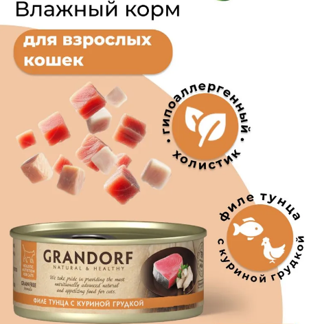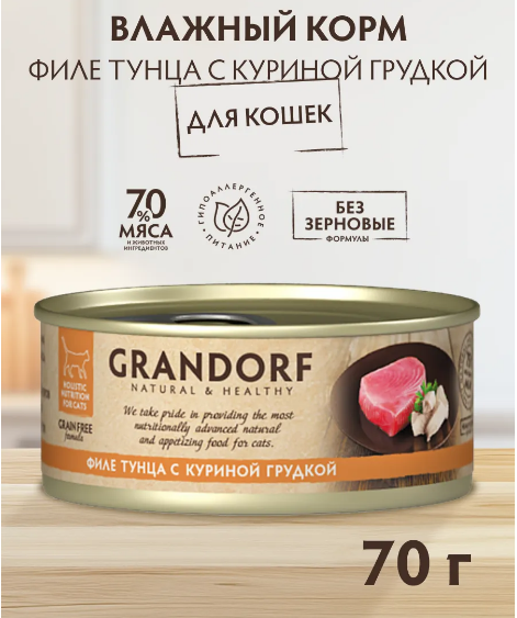 Grandorf филе тунца с куриной грудкой в собственном соку - влажный корм для кошек класса холистик. Максимум мяса и ничего лишнего! Гипоаллергенная беззерновая формула для улучшения здоровья и жизненной силы питомца.