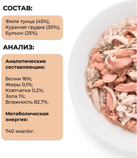 75% мяса в составе (45% филе тунца, 30% куриная грудка).