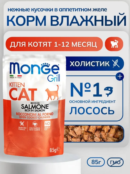 Monge (Монж) Cat Grill полнорационные беззерновые паучи из норвежского лосося для котят и беременных кошек 85г.