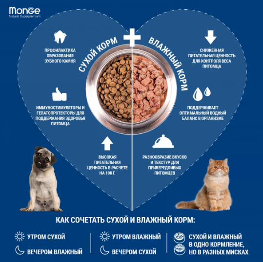 Сочетание влажного корма с сухим регулирует водный баланс организма, что особенно важно для кошек, которые пьют мало воды.