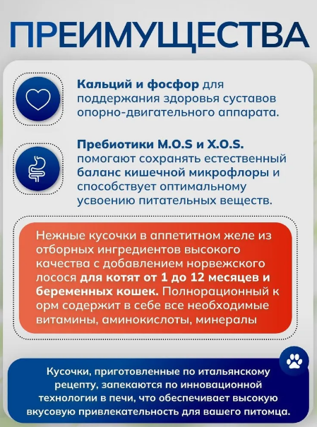 Нежные кусочки в аппетитном желе из отборных ингредиентов высокого качества с добавлением норвежского лосося для котят от 1 до 12 месяцев и беременных кошек.