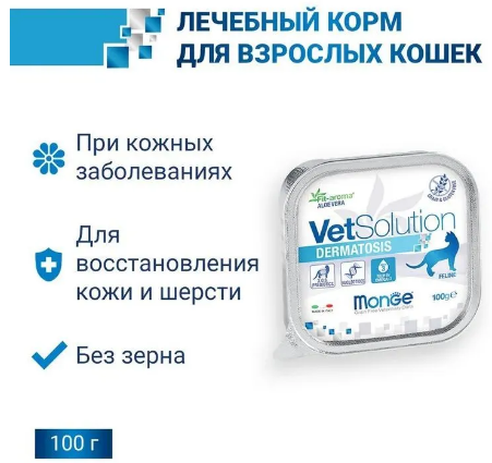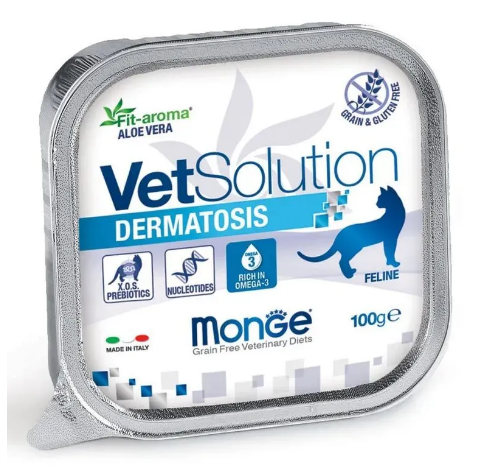 Лечебный корм Monge VetSolution Cat Dermatosis Дерматозис для кошек при заболеваниях кожи таких как дерматит, хронический зуд, заболевания кожи, сопровождающиеся воспалением при пищевой аллергии и пищевой непереносимости 100 г