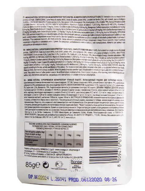Monge (Монж) Cat Speciality Line Monoprotein полнорационные беззерновые паучи из мяса утки для взрослых кошек и котов 85 г.
