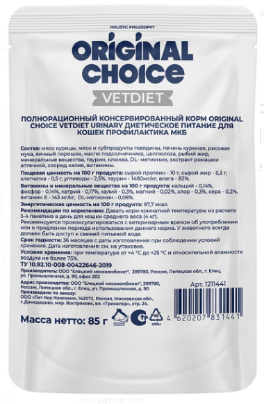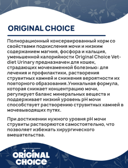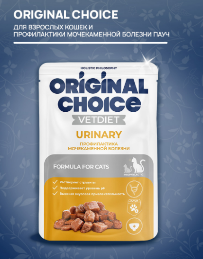 Полнорационный консервированный корм со свойствами подкисления мочи и низким содержанием магния, фосфора и кальция, уменьшенной калорийности Original Choice Vetdiet Urinary предназначен для кошек, страдающих мочекаменной болезнью: для лечения и профилактики, растворения струвитных камней и снижения вероятности их повторного образования.