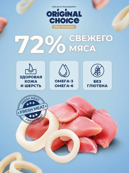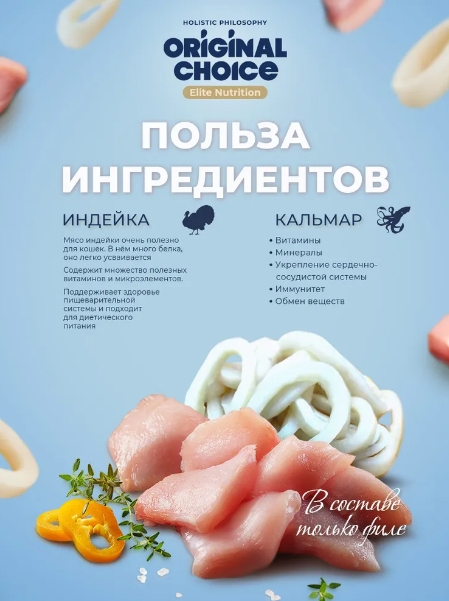 Откройте удивительный мир вкуса и заботы о Вашем питомце с ORIGINAL CHOICE Elite Nutrition Adult! Этот изысканный корм содержит нежное филе индейки и кальмара в аппетитном желе.